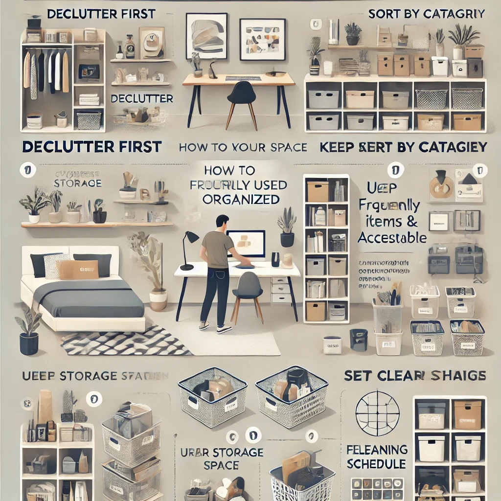 🔹 실천 방법: ✅ 벽면 수납 활용 (선반, 걸이형 보드 설치) ✅ 침대 밑, 소파 아래 등 숨은 공간 활용하기 ✅ 접이식 가구, 다용도 가구 사용해 공간 활용 높이기 ✅ 수납 박스 & 바구니 활용하여 깔끔하게 정리하기